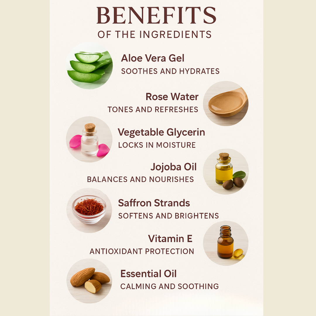 Base: Aloe Vera Gel (soothe), Rose Water (refresh), Vegetable Glycerin (hydrate)